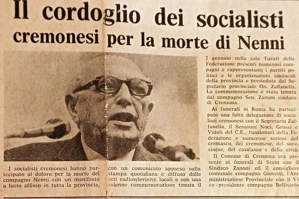 Pietro Nenni è sempre stato un punto di riferimento umano e politico per i militanti cremonesi. 39 anni fa la notizia della sua scomparsa provocò un profondo e vasto cordoglio. Manifestato attraverso impegnative iniziative commemorative. Una di queste, come ricorda l'edizione del 15 gennaio, si svolse nella sede del Circolo Turati di Corso Pietro Vacchelli, 45. Alla presenza di molti dirigenti e militanti e della rappresentanza della vita istituzionale e dei movimenti politici e sindacali, la commemorazione ufficiale del leader socialista fu pronunciata dall'allora Sindaco della Città, Emilio Zanoni.