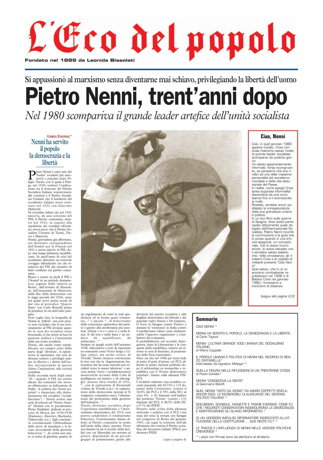 Alcuni giorni fa, quando ci apprestavamo a considerare l'opportunità di un richiamo, anche sulla nostra testata, dell'anniversario della scomparsa di Pietro Nenni, non avevamo minimamente immaginato di fare cosa gradita a molti dei nostri abituali lettori. Che hanno riscontrato tale gradimento, nelle modalità correnti. Qualcuno ci ha contattato anche telefonicamente sia per manifestare apprezzamento sia per interloquire su aspetti della ricca personalità del leader socialista.