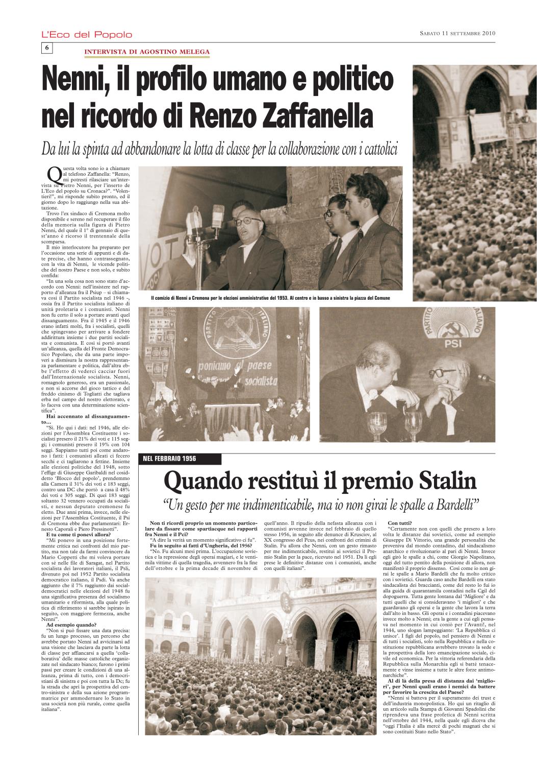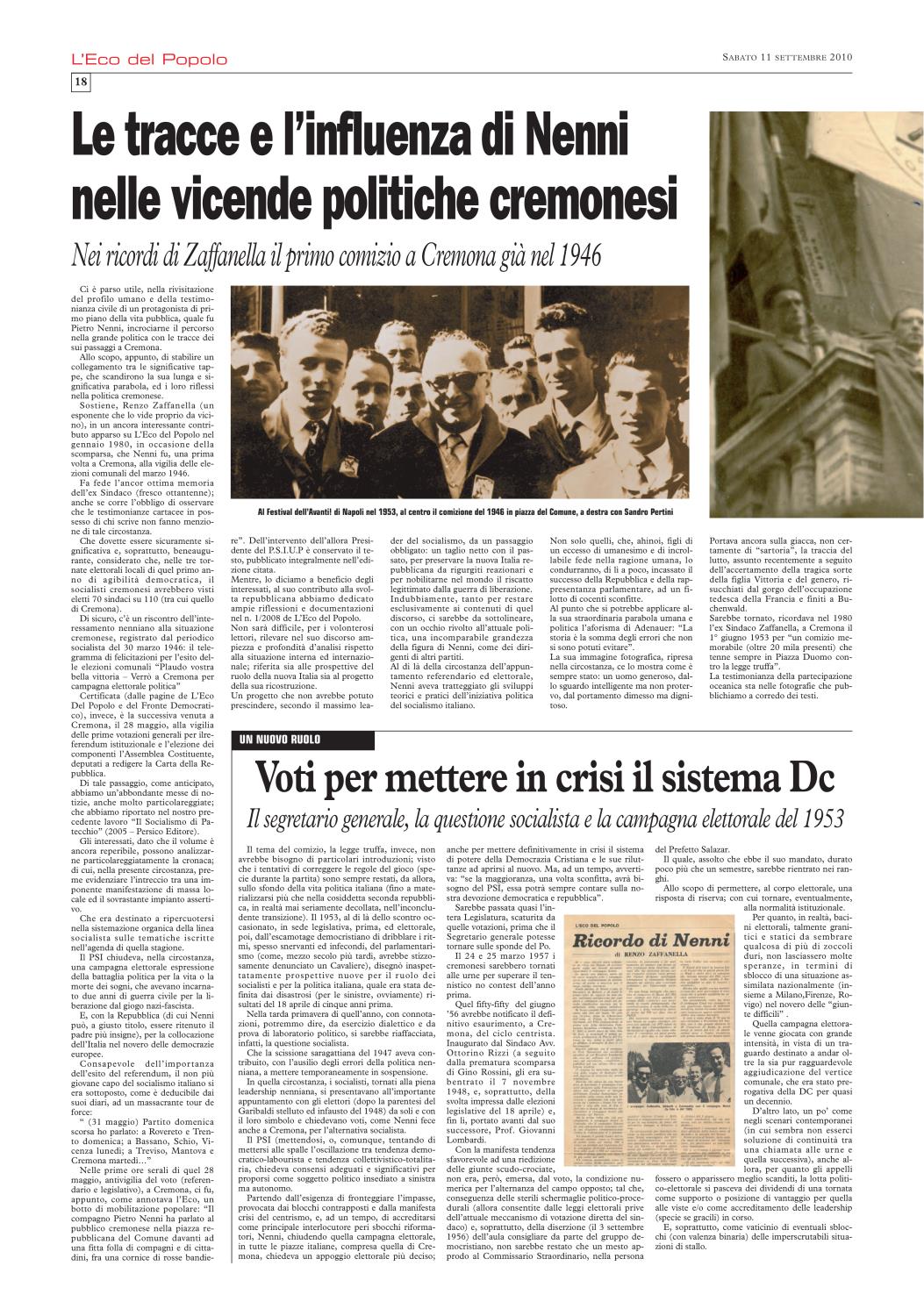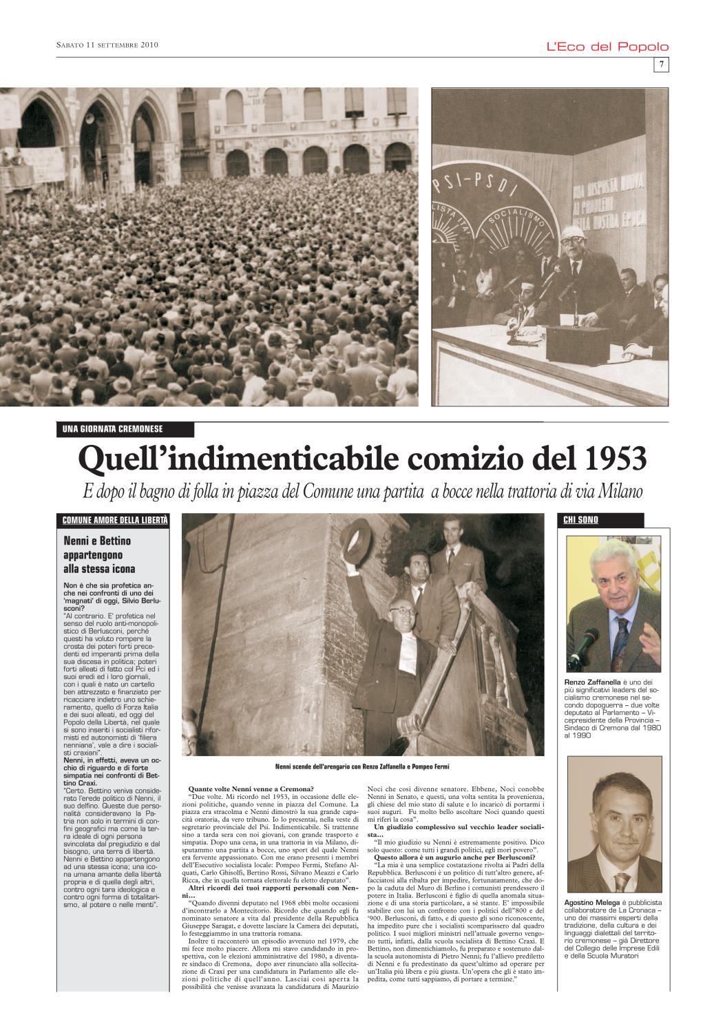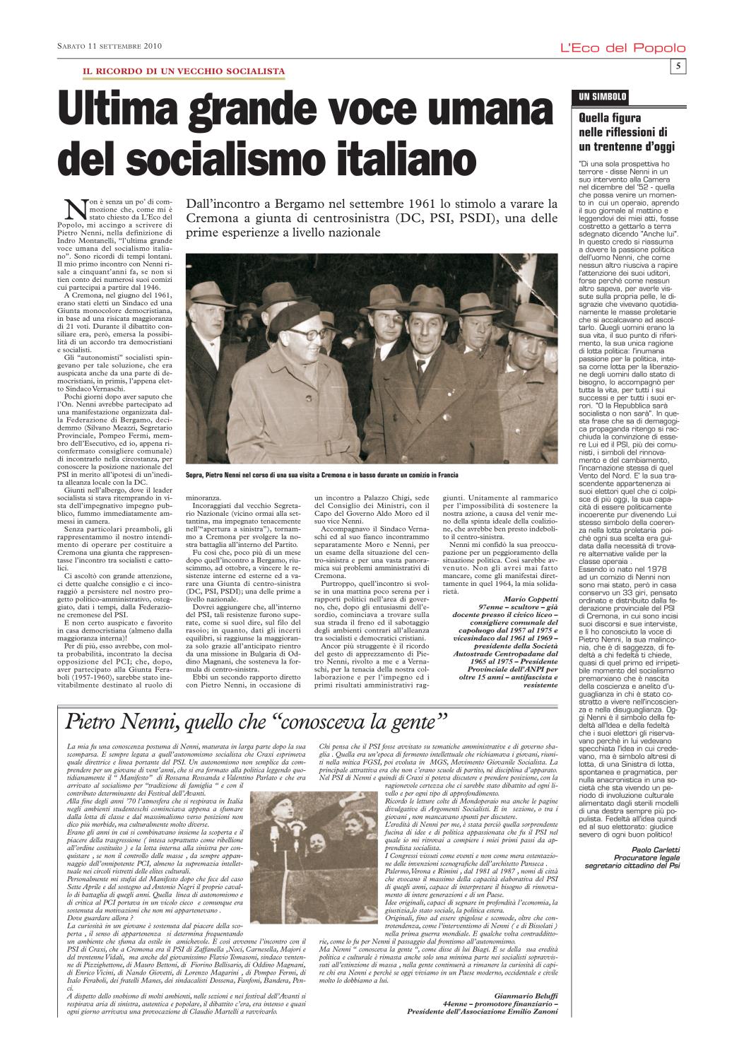 Non ci è stato difficile ricordare che), nel settembre del 2010, L'Eco del Popolo (grazie alla generosa disponibilità del quotidiano La Cronaca, del suo Direttore Mario Silla, del prezioso Fabrizio Loffi) gli aveva dedicato un'edizione monografica. In cui la rivisitazione del profilo biografico, nella sua dimensione nazionale, si accompagnava all'approfondimento dei punti di contatto con la realtà cremonese.