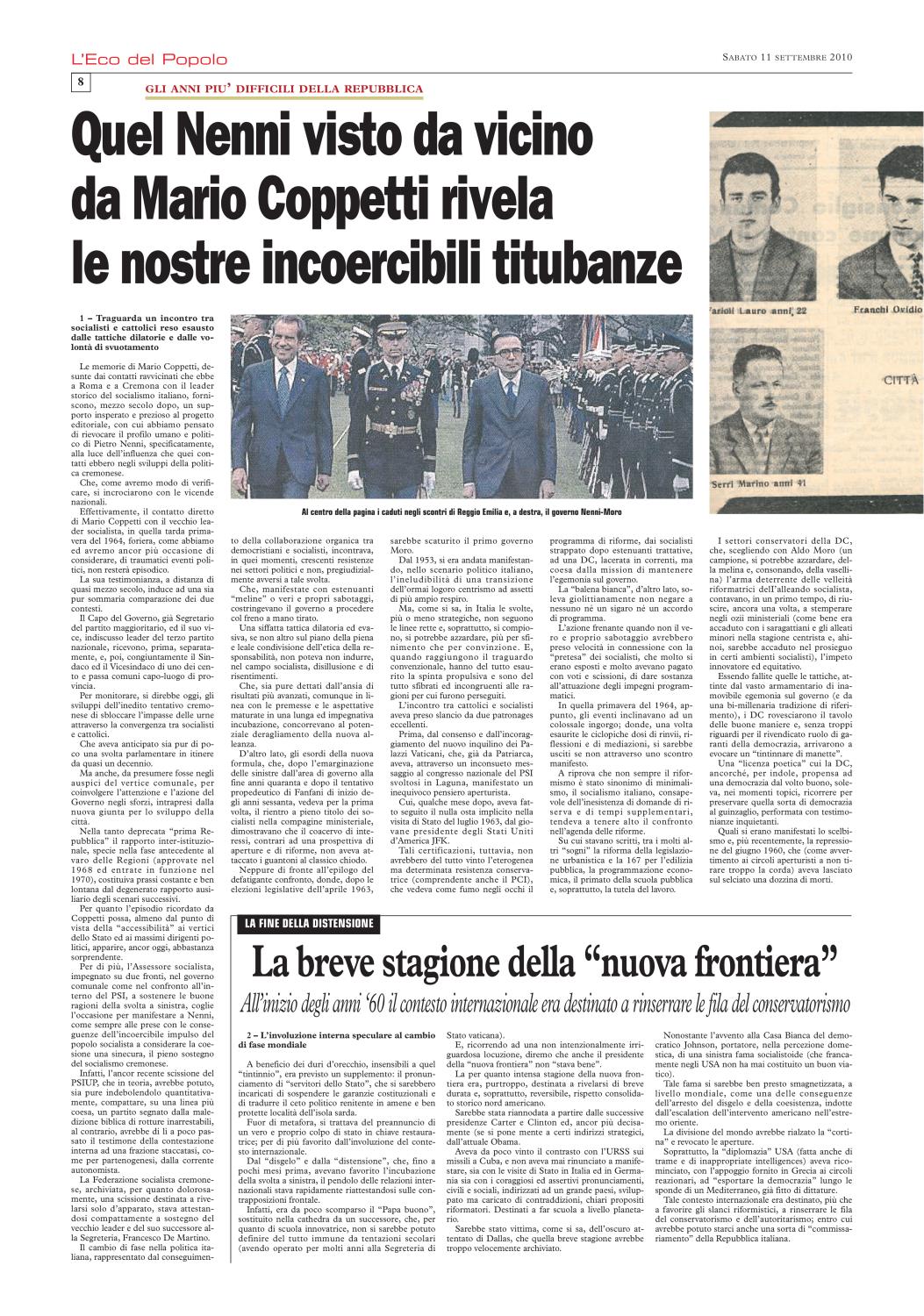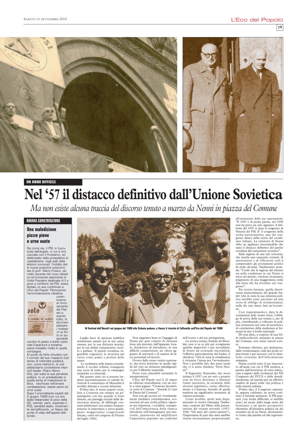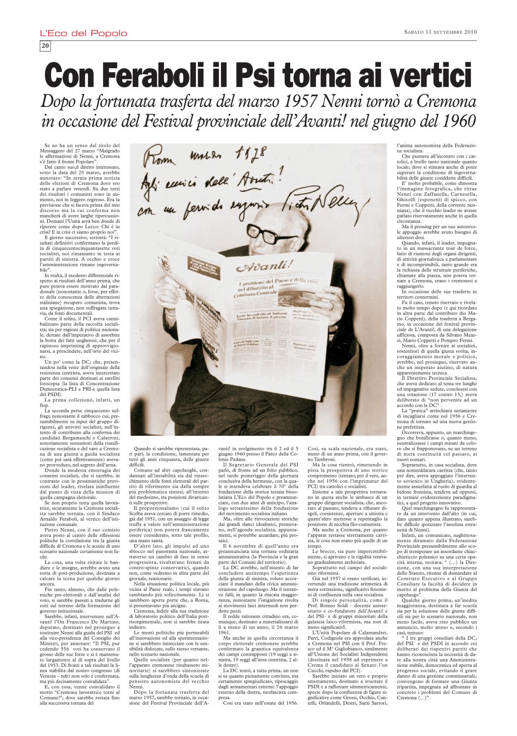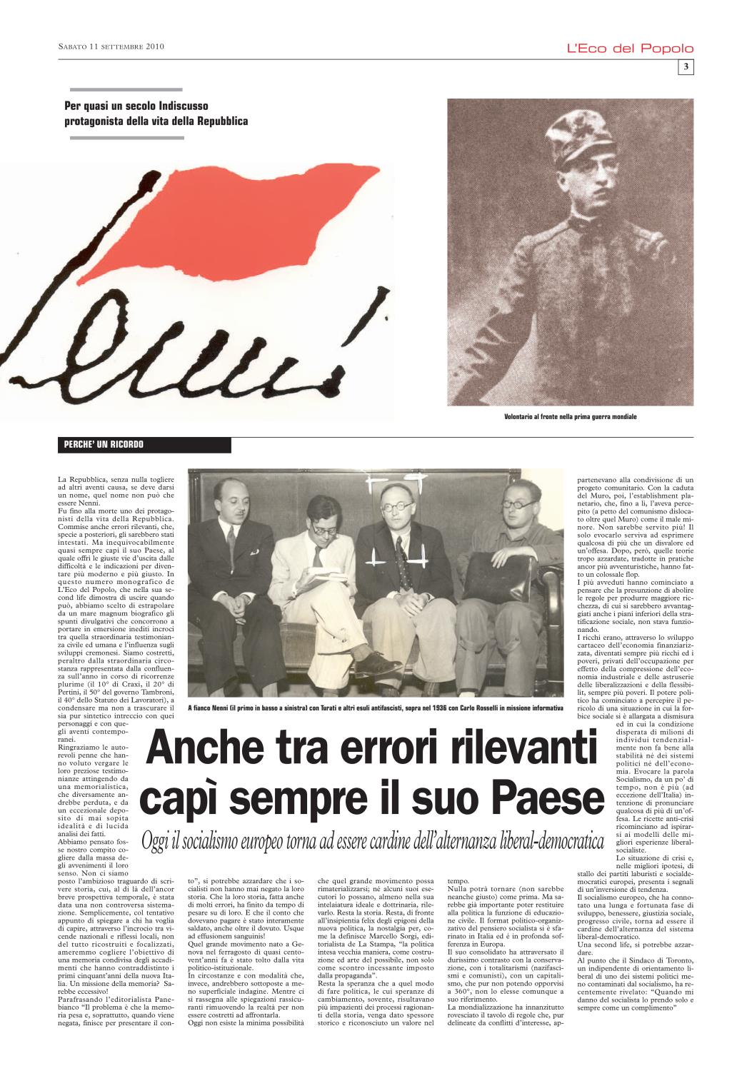 Non ci è stato difficile ricordare che), nel settembre del 2010, L'Eco del Popolo (grazie alla generosa disponibilità del quotidiano La Cronaca, del suo Direttore Mario Silla, del prezioso Fabrizio Loffi) gli aveva dedicato un'edizione monografica. In cui la rivisitazione del profilo biografico, nella sua dimensione nazionale, si accompagnava all'approfondimento dei punti di contatto con la realtà cremonese.