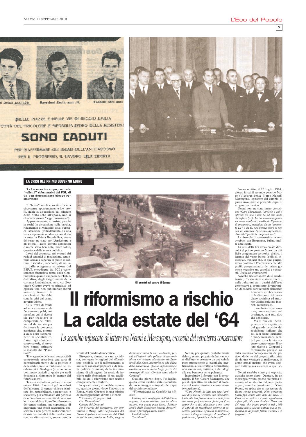 Da troppe decadi la vita pubblica italiana (oseremmo, la vita pubblica europea e forse mondiale) non si avvale di questi giganti (di umanità e di idealismo). Nenni può essere assunto come il termine di riferimento di una coscienza alla ricerca, innanzitutto, delle soluzioni congrue e coerenti con i suoi ideali di democrazia e di giustizia sociale. Raramente nel nostro Paese, maggiormente propenso alla demagogia che non al gradualismo, la concretizzazione di questi ideali si è potuta avvalersi di un'organica stagione riformista, suscettibile di fornire un impulso organico alla modernizzazione ed a progetti equitativi. Ciò avvenne per un breve periodo degli anni Sessanta per effetto di una stagione destinata ad incrociare il riformismo dei socialisti, guidati da Pietro Nenni, e dei cattolici democratici, orientati da Aldo Moro.
