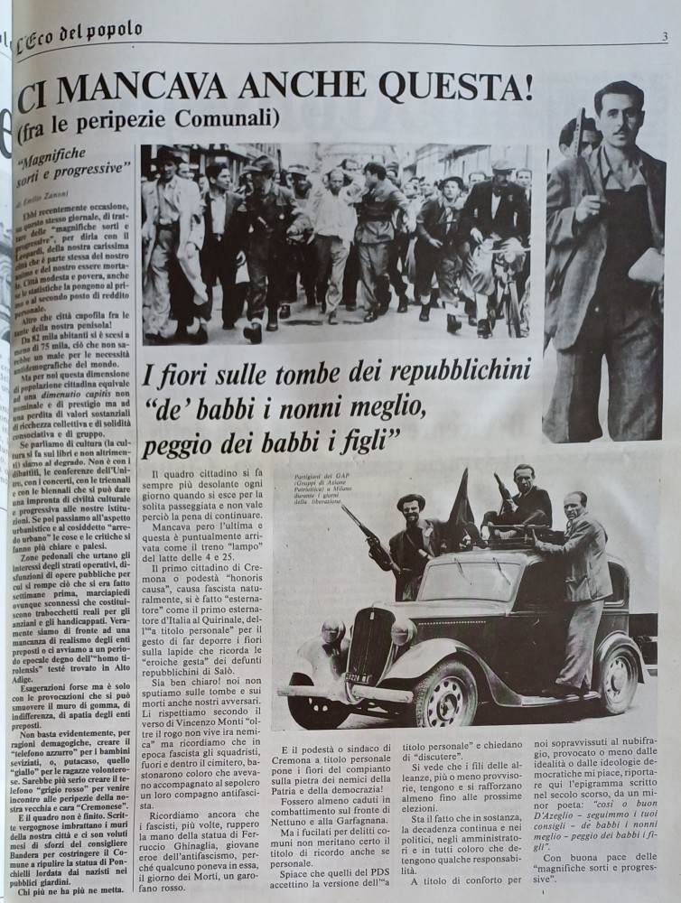 A dire il vero, non è cosa nuova. Anzi, Cremona, in tutto il mezzo secolo pregresso ha fatto da apripista in queste immonde onoranze. Che se si volessero (i detentori di mandato ad agire) veramente proibire, ci sarebbero tutte le condizioni per…