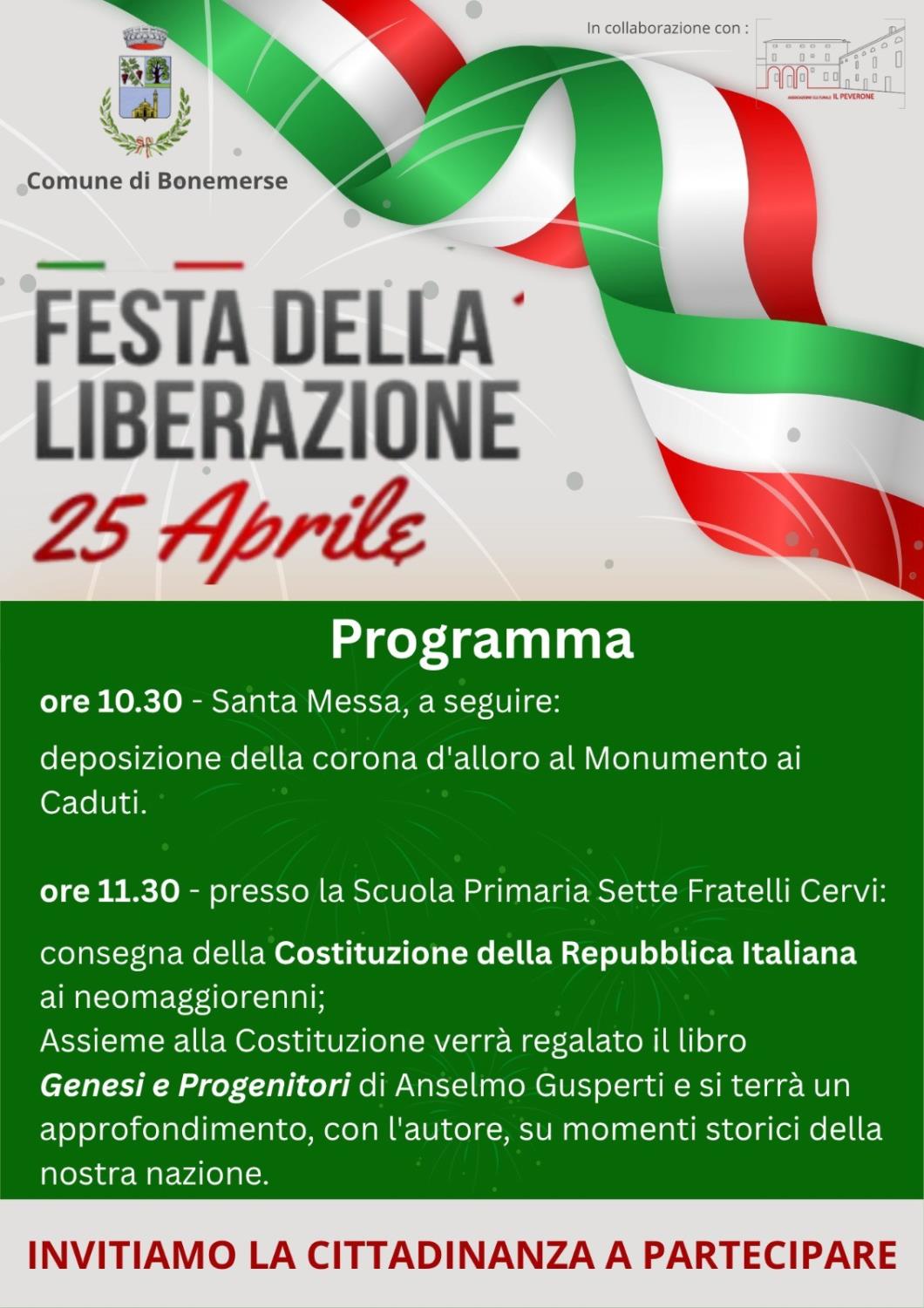 In occasione dell'81° anniversario della Liberazione, il Comune di Cremona, in collaborazione con il Comitato Costituzione Liberazione (Associazione Nazionale Partigiani Italiani, Associazione Nazionale Partigiani Cristiani di Cremona, Associazione Nazionale Divisione Acqui – Sezione di Cremona) ha predisposto il programma per la celebrazione del 25 Aprile.