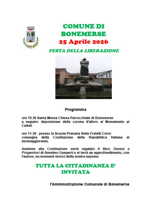 La cerimonia in piazza del Comune inizierà alle ore 11 introdotta da una rappresentazione scenica a cura de “La Compagnia dei Piccoli” con il coordinamento di Mattia Cabrini, vedrà gli interventi di Roberto Mariani, presidente della Provincia di Cremona, di Franco Verdi, presidente della sezione di Cremona dell'Associazione Nazionale Partigiani Cristiani, per le Associazioni partigiane di Cremona, e infine del sindaco Andrea Virgilio.