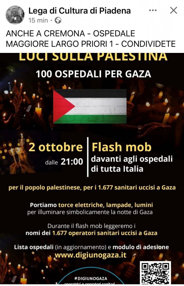 Venerdì 3 ottobre alle ore 21, presso il mercatino Emmaus di Canove de' Biazzi (Torre de' Picenardi), Giuditta Brattini, cooperante dell'associazione Fonti di Pace, attiva in Palestina da vent'anni, su progetti di riabilitazione fisica e psicologica di bambini che hanno subito traumi, parlerà della drammatica situazione di Gaza e del popolo palestinese e illustrerà la mostra “Le voci dei bambini di Gaza” che comprende 26 disegni realizzati da bambini di Gaza, tra i 6 e i 12 anni, che erano sfollati nel campo di Deir al-Balah.