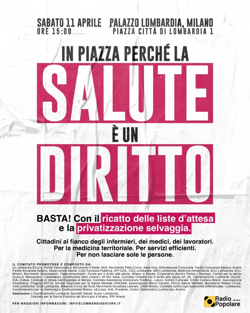 riportiamo nota stampa riguardo l'importante mobilitazione per il diritto alla Salute che si terrà a Milano Sabato 11 aprile e alla quale parteciperà anche la CGIL di Cremona.