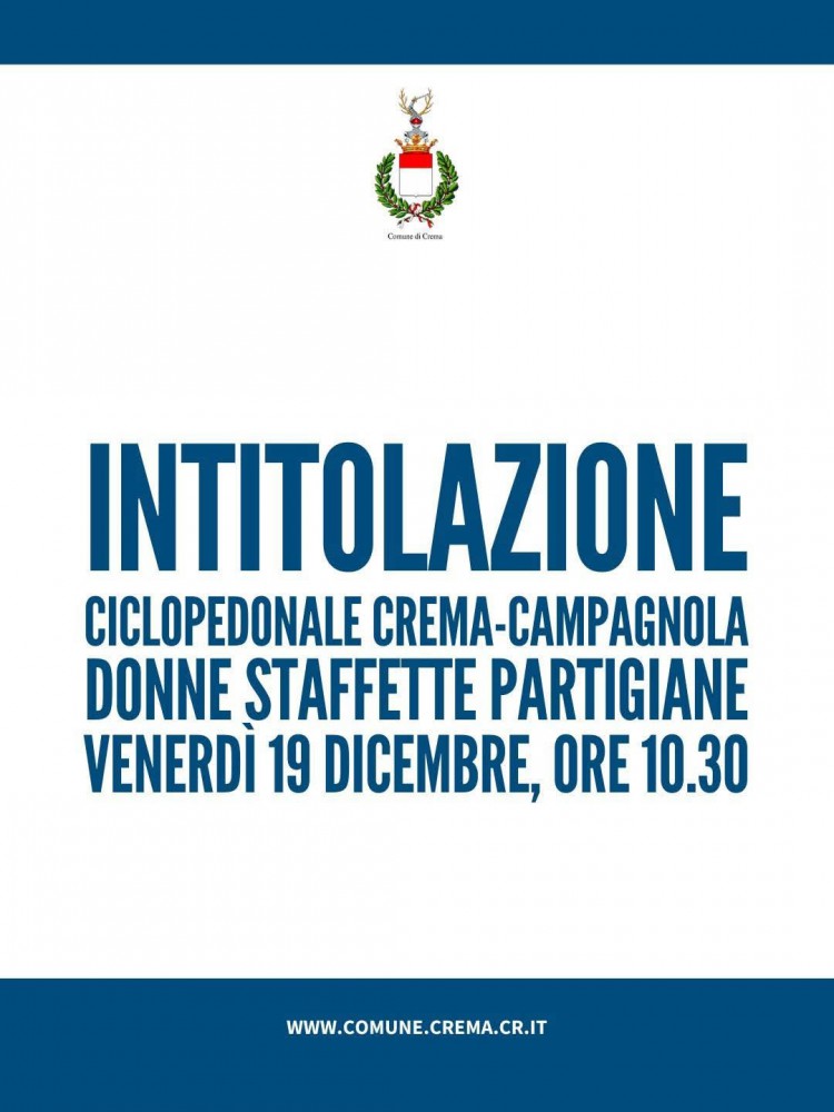Venerdì 19 dicembre 2025, alle 10.30, la ciclopedonale Crema-Campagnola sarà intitolata alle Donne Staffette Partigiane. L'appuntamento è all'inizio del percorso, alla rotonda di via Caravaggio – incrocio con via Brunelli, nel quartiere di Santo Stefano.