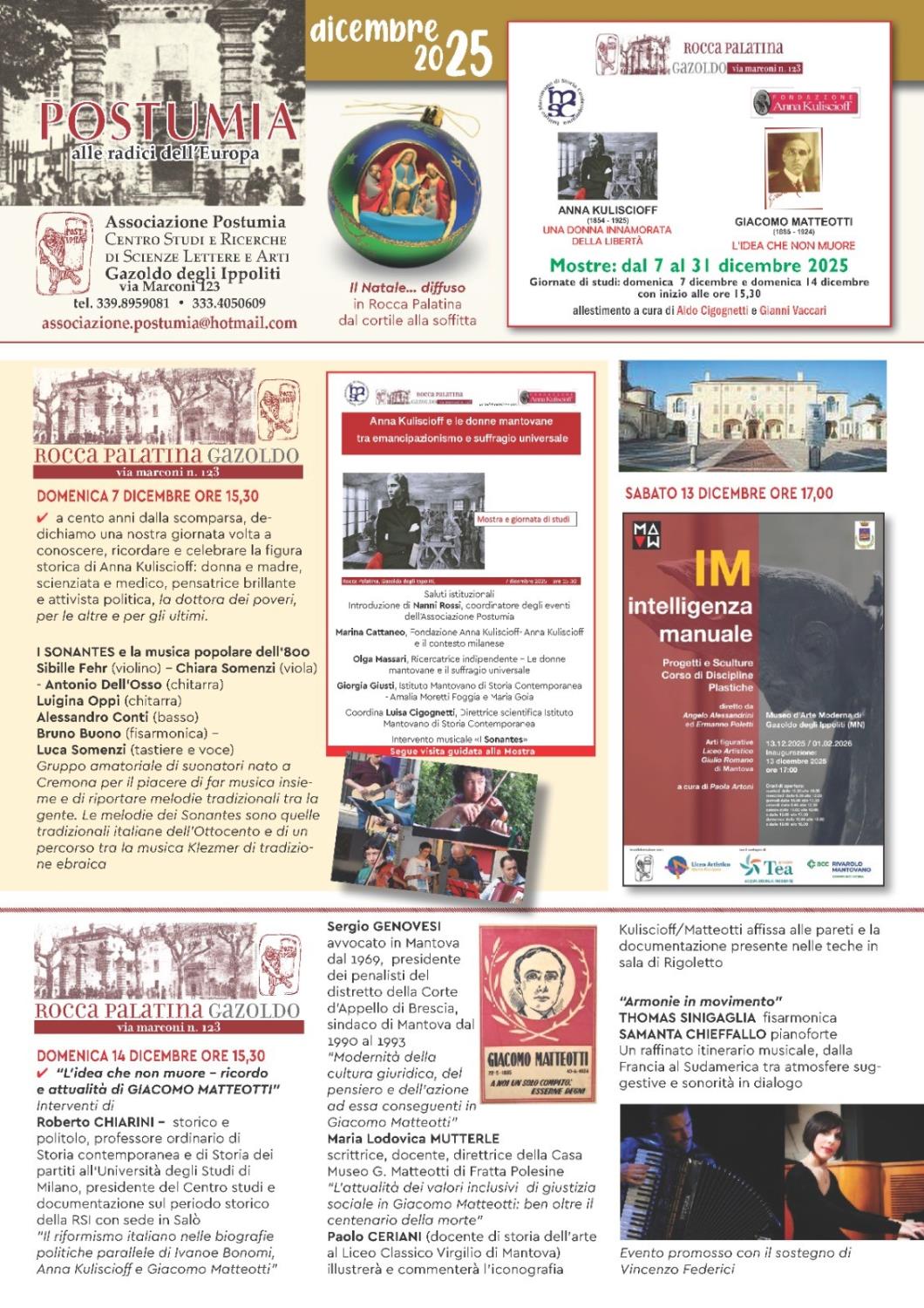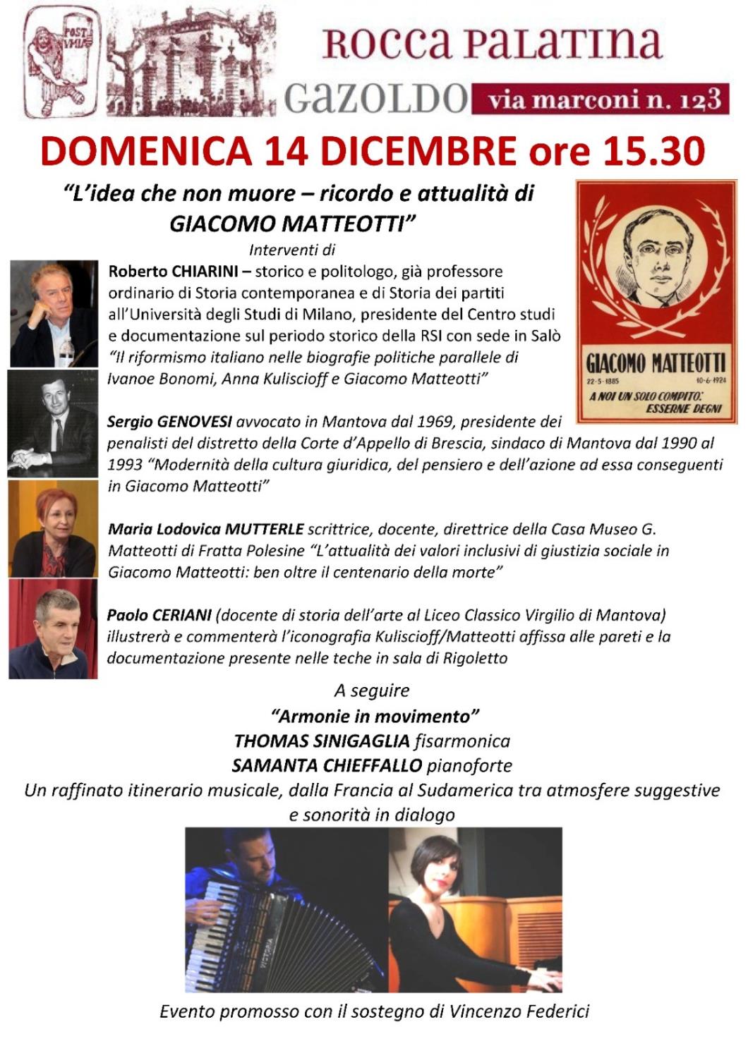 Se le prevedibili ricadute dell'ingravescente aetate ci consentissero una moratoria, parteciperemmo con animo appagato e grato nei confronti dell'amico e compagno Nanni Rossi e della benemerita “Rocca Palatina”, un prezioso sodalizio capace di produrre un'incessante e qualificatissima offerta di cultura, arte, convivialità. In tutte le modalità delle Muse e del sapere. In particolare della cultura storica. Epicentro di questa e della precedente locandina la rivisitazione dei profili di due giganti della civiltà politica e della sinistra (riformista) del 900: Anna Kuliscioff (nel rapporto con l'emancipazione delle donne mantovane) e Giacomo Matteotti (assurto dall'anno del centenario a protagonista assoluto dell'approfondimento e, diciamolo senza iattanza, di un insperato recupero di centralità e verità). Ovviamente, considerata la mission di questa testata, la cosa non può non far piacere, a noi ed alla verità storica. Per di più questa dedizione applicata alla rivisitazione di questi campioni della democrazia e delle buone cause civili e sociali viene, come nel caso del sodalizio di Gazoldo, proposta con un'offerta plurimodale, il cui panel mette in campo dotti approfondimenti storico-culturali e significativi campionari di arti grafiche.