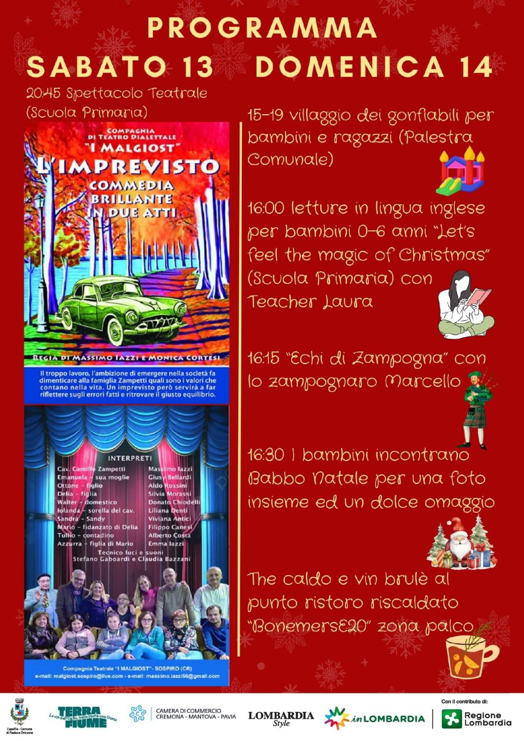 Per quanto riguarda le bancarelle solidali, saranno presenti le cooperative Antares con le sue creazioni in carta, Cosper con i prodotti sartoriali di Creazioni Migranti, Borea e Varietà con bijoux e oggettistica de Le Follie, Nazareth con i prodotti bio dell'Azienda agricola sociale Rigenera e Gamma con le proposte della sartoria Un Filo Pazzesco. Dalle 16.30 inizieranno i laboratori dedicati a bambini e famiglie, con la realizzazione di addobbi di Natale guidata da Un Filo Pazzesco e l'attività “La magia del Natale anche nel piatto” proposta dall'ASST di Cremona. Per una pausa gustosa, il food truck Bistrottino, il bar BonBistrot e Rigenera offriranno merende e aperitivi per tutti i gusti. Dalle 18 spazio alla musica con la cover band FuoriTempo. Un'occasione di incontro e partecipazione per tutta la comunità, nella valorizzazione del lavoro delle realtà sociali del territorio e nel desiderio di condividere lo spirito solidale delle prossime festività.