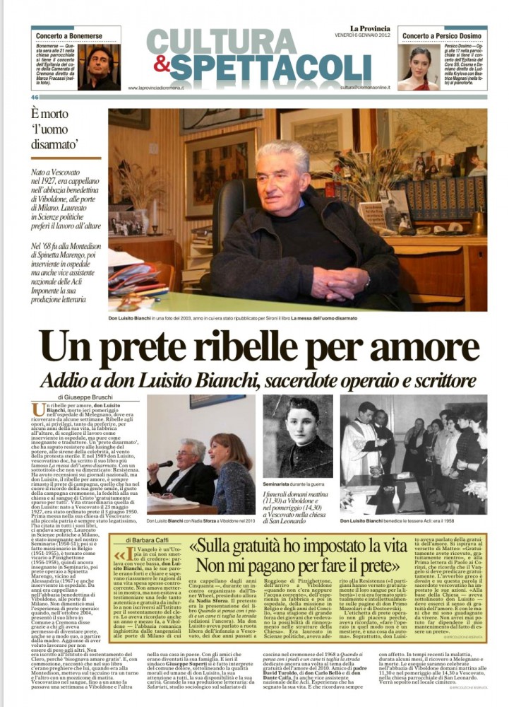 Saremmo omissivi se non aggiungessimo alla sintetica scheda due particolari di incrocio con questa grande figura di sacerdote e testimone sociale e civile. Don Bianchi fu vicario, come mi ricorda il ricercatore pizzighettonese ed amico Gianfranco Gambarelli, nella parrocchia di Roggione Pizzighettone (cittadina in cui è nato chi scrive qui). Diciamo che in un borgo, all'epoca fortemente industrializzato (con i 1500 dipendenti della Pirelli e di un forte indotto occupazionale), la “mano” di un sacerdote che diversamente dal clero locale si faceva sentire a fianco della condizione dei lavoratori. L'altro incrocio riguarda un docente in comune: Francesco Alberoni. Che Don Luisito ebbe a Scienze Politiche e chi scrive, molti anni dopo, a Sociologia a Trento.