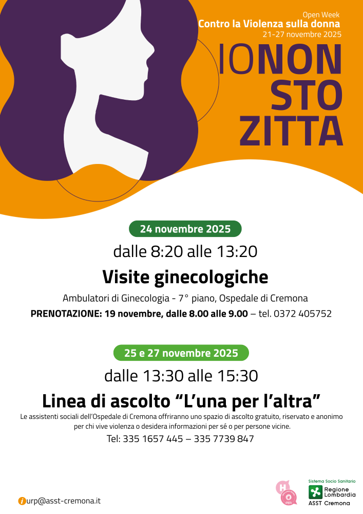 Martedì 24 novembre 2025, dalle 8.20 alle 13.20, l'Unità Operativa di Ginecologia e Ostetricia dell'Ospedale di Cremona offre visite ginecologiche su prenotazione. Le prenotazioni saranno aperte mercoledì 19 novembre, dalle 8 alle 9, chiamando il numero dedicato 0372 405 752. «Nel silenzio non c'è guarigione», sottolinea Annalisa Abbiati (Direttore facente funzioni di Ostetricia e Ginecologia dell'Ospedale di Cremona). «Il nostro servizio è accanto a ogni donna vittima di violenza: un luogo sicuro, dove essere accolte, credute e sostenute. Non sei sola: condividere è il primo passo per riprendere in mano la propria vita».