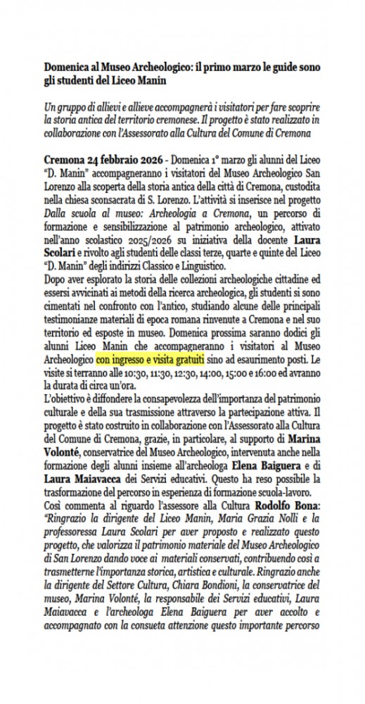 Il Comune di Cremona aderisce alla campagna di comunicazione Contro la Violenza sulle Donne, Mai Bandiera Bianca Promossa da ANCI insieme al Dipartimento Pari Opportunità della Presidenza del Consiglio dei Ministri, per esprimere l'idea che le istituzioni non debbano assolutamente arretrare di fronte al fenomeno della violenza maschile sulle donne Cremona, 25 febbraio 2026. Nella seduta odierna, su proposta dell'assessora con delega alle Pari Opportunità, Marina Della Giovanna, la Giunta ha deliberato l'adesione del Comune di Cremona alla campagna di comunicazione istituzionale Contro la Violenza sulle Donne, Mai Bandiera Bianca, promossa da ANCI insieme al Dipartimento Pari Opportunità della Presidenza del Consiglio dei Ministri, per esprimere l'idea che le istituzioni non debbano assolutamente arretrare di fronte al fenomeno della violenza maschile sulle donne. La campagna, lanciata a Roma alcune settimane fa, individua come strumento principale una bandiera di colore rosso-arancione, il colore dell'Obiettivo 5 dell'Agenda ONU 2030, dedicato alla parità di genere. Pertanto, a partire dal prossimo 8 marzo, Giornata Internazionale della Donna, la bandiera verrà ufficialmente esposta sulla facciata di Palazzo Ala Ponzone, sede del Centro Locale di Parità del Comune, in corso Vittorio Emanuele II, a testimoniare il permanente impegno dell'Amministrazione comunale sui temi del contrasto alla violenza di genere e delle pari opportunità. La campagna si svilupperà lungo tutto il 2026 (#25novembretuttolanno) e coinvolgerà l'intera cittadinanza, soprattutto le scuole, attraverso la promozione di una pluralità di iniziative di comunicazione, informazione e sensibilizzazione e la realizzazione di gadget, andandosi ad integrare nel calendario degli eventi culturali della città così come in quello delle celebrazioni per l'ottantesimo anniversario della Repubblica e del riconoscimento del diritto di voto alle donne. E' inoltre previsto il coinvolgimento di alcune figure pubbliche riconosciute a livello locale affinché diventino ambassador del messaggio, in particolare tra le giovani generazioni, anche attraverso l'utilizzo dei canali social. “Il Comune di Cremona nel decidere di aderire a questa importante iniziativa istituzionale, cominciando con l'esposizione per l'8 marzo della bandiera che la simboleggia, intende riaffermare il proprio convinto e costante impegno a favore del diritto delle donne alla libertà e alla piena autodeterminazione”, dichiara l'assessora Marina Della Giovanna, che aggiunge “auspichiamo la partecipazione a questa campagna di tutti i soggetti della comunità cremonese che ne condividono il messaggio e che intendano farsene promotori lavorando insieme a noi”.