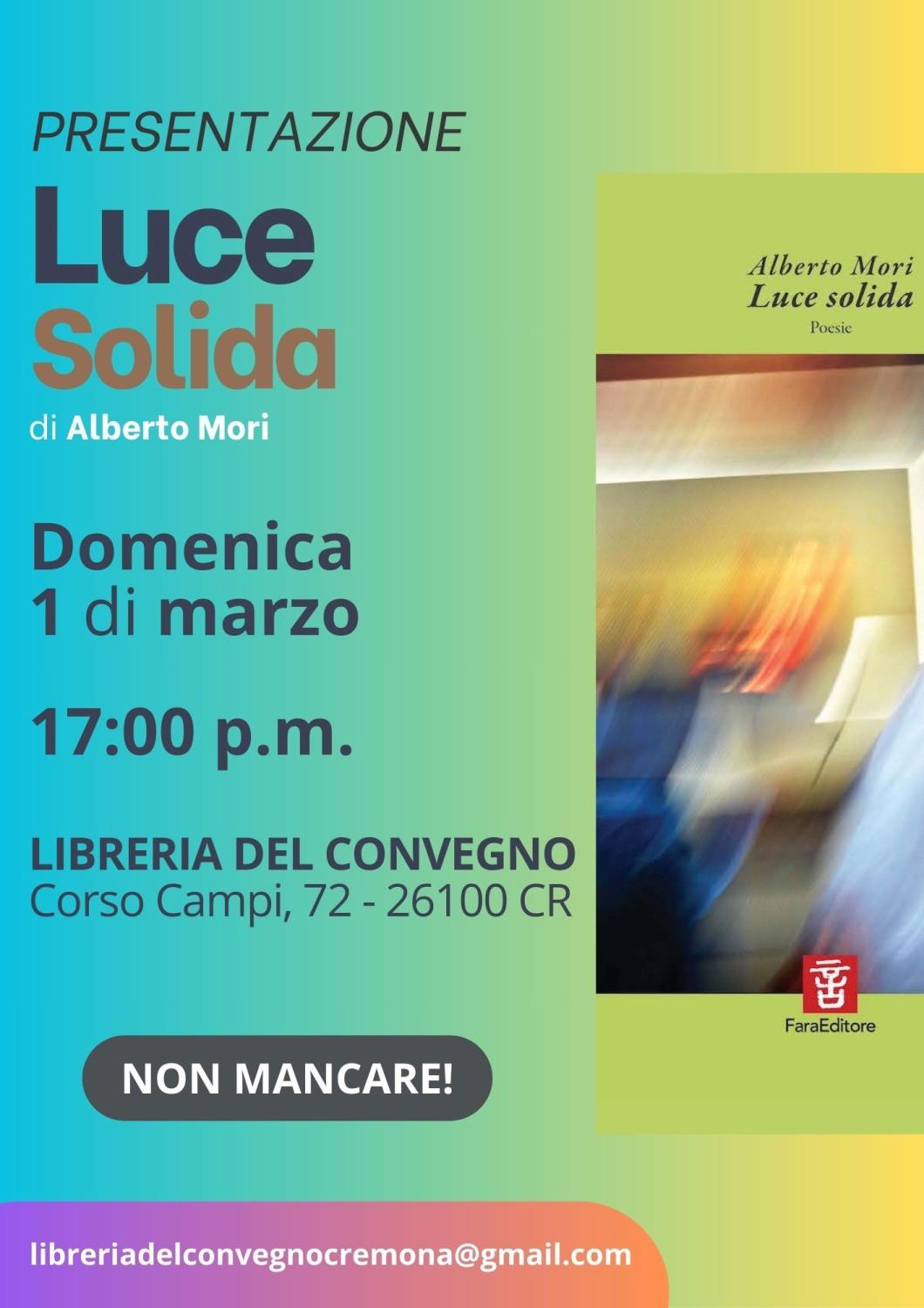 Domenica 1 Marzo alle ore 17.00, presso la Libreria del Convegno in C.so Campi 72 a Cremona, Alberto Mori presenterà con una performance il libro Luce solida, Fara Editore, 2025.