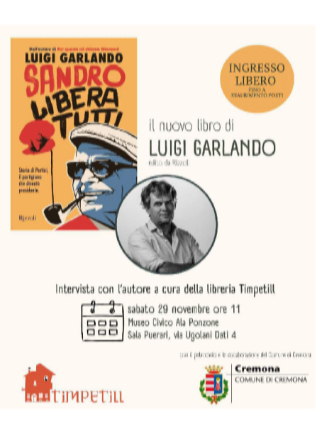 Luigi Garlando scrittore e giornalista di punta della Gazzetta dello Sport, noto soprattutto per alcuni libri entrati nell'elenco dei classici per i ragazzi, come Per questo mi chiamo Giovanni, dedicato alla vita e all'esempio di Giovanni Falcone, torna in libreria e a Cremona con il suo ultimo libro: Sandro libera tutti, edito da Rizzoli. Parlando del suo libro Garlando dice di avere voluto raccontare ai giovani questo grande uomo, la sua vita, il suo coraggio, il suo amore per la libertà e la pace, un uomo che può “continuare ad essere un esempio, con la convinzione che non esistano argomenti per grandi che non possano essere raccontati anche ai più piccoli”. In cento capitoli veloci ed emozionanti, Luigi Garlando compone il ritratto intimo di un ragazzo eccezionale che con la sua lezione di umanità ha fatto la storia del Novecento italiano. Sandro Pertini, figlio di una famiglia agiata, da grande vorrebbe fare l'ebanista. L'Italia dei primi del Novecento è un paese in fermento: la distanza tra ricchi e poveri è enorme, il vento del socialismo scuote le piazze, l'entusiasmo interventista spinge alla guerra. Crescendo, Sandro capisce che non è il legno ciò che vuole modellare, ma la società. Per renderla migliore, perché sia un luogo di giustizia e libertà per tutti. Cresce in lui la passione per la politica, quella che ha a cuore le persone e il bene comune. Sarà questa spinta a determinare la sua esistenza, a consentirgli di sopportare gli anni di carcere, di lottare contro il fascismo, di impegnarsi giorno dopo giorno per la neonata Repubblica italiana, fino a diventarne il presidente. Il presidente più amato dagli italiani. “Sono onorato di ospitare in Sala Puerari la presentazione del bel libro di Luigi Garlando dedicato a Sandro Pertini, partigiano, socialista e politico antifascista italiano, figura centrale della lotta partigiana e della resistenza contro il nazifascismo, che gli costò la prigionia e l'esilio”, dichiara l'assessore alla Cultura Rodolfo Bona, che aggiunge: “Indimenticato Presidente della Repubblica dal 1978 al 1985, Pertini fu simbolo di unità nazionale incarnando i valori di libertà, pace e giustizia sociale, principi che ribadì con forza durante tutto il suo impegno politico, diventando figura di riferimento, soprattutto per le giovani generazioni. Ringrazio pertanto la libreria Timpetill e l'autore Luigi Garlando per questa bella occasione di ripercorrerne la biografia con particolare attenzione ai più giovani”.