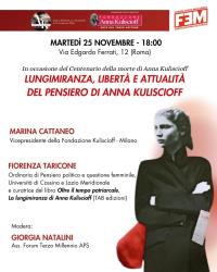 "Il 29 dicembre di 90 anni fa moriva Anna Kuliscioff, la “dottora dei poveri” che lottò per il diritto di voto delle donne. Per sottolinearne il grande carisma, il filosofo Antonio Labriola la definì “l'unico uomo del socialismo italiano”. Anna Rosenstejn nasce in Ucraina nel 1857, figlia di un'agiata famiglia di mercanti ebrei. Nel 1871 inizia gli studi a Zurigo dove cambia il nome in Kuliscioff, probabilmente utilizzando il termine tedesco “kuli”, facchino. Medico, giornalista, ma soprattutto protagonista delle battaglie politiche e sociali, la sua formazione politica è permeata dalla concezione materialistica della storia. Anna Kuliscioff è la figura femminile più importante del riformismo socialista. Fu in primo piano nelle lotte per la piena parità tra i sessi, per i diritti delle donne lavoratrici e madri nei luoghi di lavoro e per il suffragio universale. Nel suo fascicolo informativo del 1899, raccolto dalla Prefettura di Milano, si afferma che “ ha molta influenza data la sua intelligenza e cultura”. Anna non accettava ambiguità, era realista ma coraggiosa, capace di analisi acute e di proposte concrete. Straordinario fu il suo legame affettivo e politico con Filippo Turati con il quale pur non mancò di registrare divergenze di analisi e proposte di cui dava conto puntualmente la “Critica Sociale”.