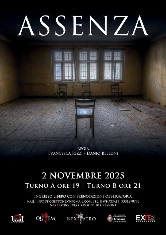 Eugène Ionesco. “I corsisti si sono concentrati su alcuni temi forti - ci dice Francesca Rizzi, la regista e direttrice artistica - in particolare il senso dell'attesa e del vuoto, quel grande vuoto esistenziale che serpeggia in tutte le pagine del testo. Da lì abbiamo elaborato testi, situazioni sceniche e riflessioni tutte nostre, che sempre più hanno avuto il loro fulcro nella vertigine dell'assenza… l'assenza di qualcuno o di qualcosa, ma anche di un tempo e di uno spazio definibili. Ed alla fine, nel nostro dramma ognuno ha trasfuso qualcosa di sé,creando personaggi e storie che fluttuano tra la realtà ed il sogno, come a voler ritrovare una consistenza umana che giustifichi le ore, i giorni e le opere di un tempo vano”. «Assenza» porterà in scena, oltre a Paolo Ascagni, Clotilde Elena Caiazza, Antonella Marrone, Marco Mastronicola, Laura Perlasca, Nicol Pinazzo, Valentina Rizzi, Roberta Schiavi, Beatrice Spampinato, Isabella Vercelli e Alberto Veltroni. La regia sarà curata da Francesca Rizzi, la direzione tecnica da Danio Belloni.