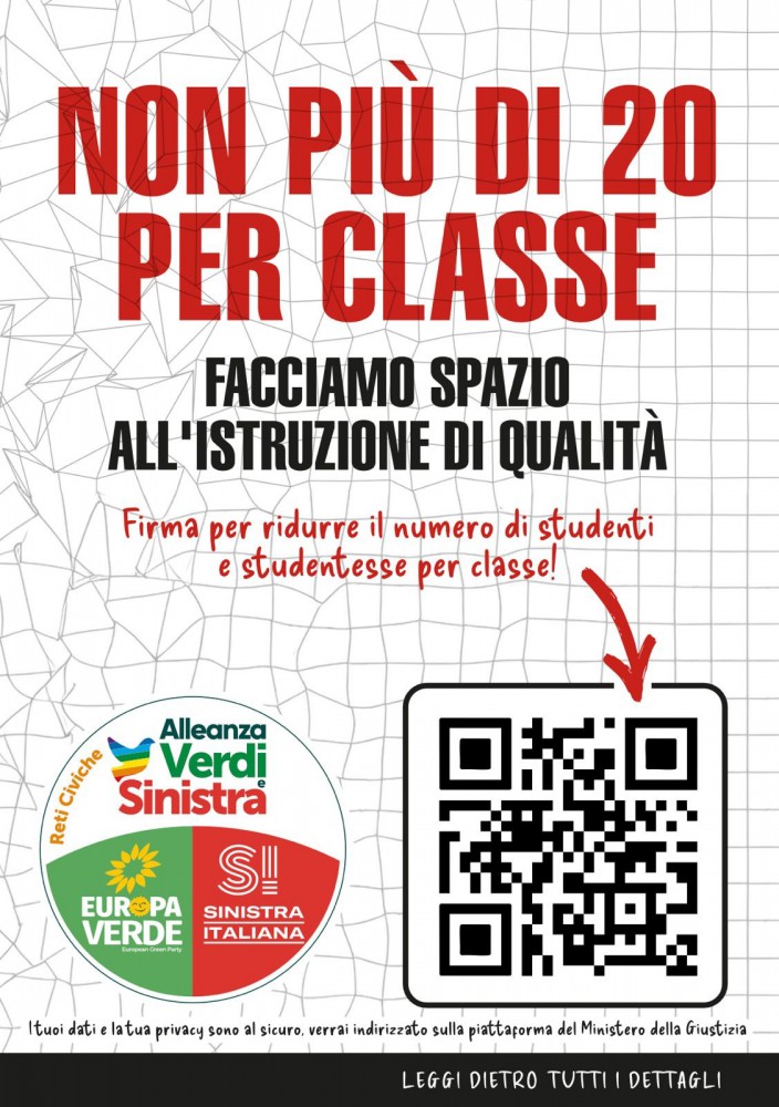 si terrà una conferenza stampa in cui presenteremo l'avvio a Crema della campagna “Non più di 20 per classe – facciamo spazio all'istruzione di qualità”, proposta di legge di iniziativa popolare promossa da Alleanza Verdi e Sinistra.