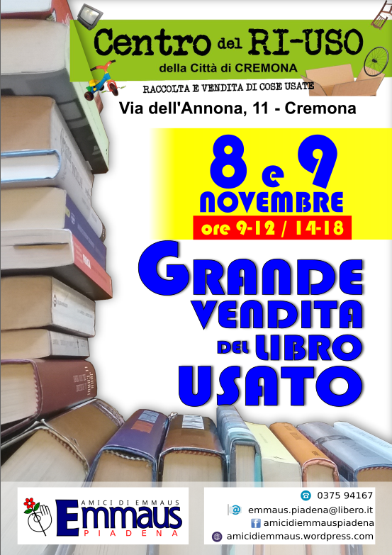 Sabato 8 e domenica 9 novembre dalle ore 9 alle 12 e dalle 14 alle 18 si svolgerà la sesta edizione della grande vendita del libro usato presso il Centro del Riuso di Cremona situato in Via dell'Annona, 11 presso l'ex mercato ortofrutticolo nei pressi dello stadio.