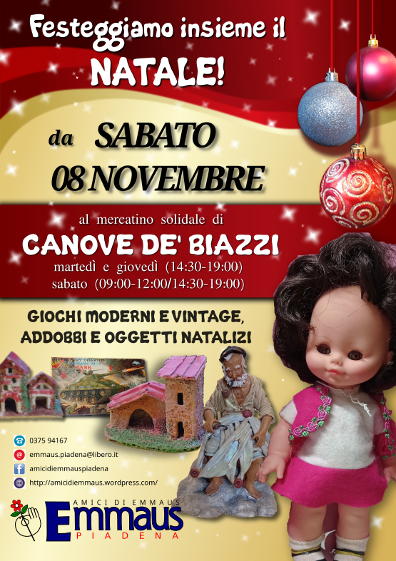 A partire da sabato 8 novembre al mercatino solidale Emmaus di Canove de' Biazzi (Torre de' Picenardi) si terrà invece la consueta vendita di articoli natalizi e giocattoli di Santa Lucia. Il mercatino di Canove de' Biazzi è aperto il sabato dalle 9 alle 12 e dalle 14:30 alle 19, il martedì e il giovedì dalle 14:30 alle 19.