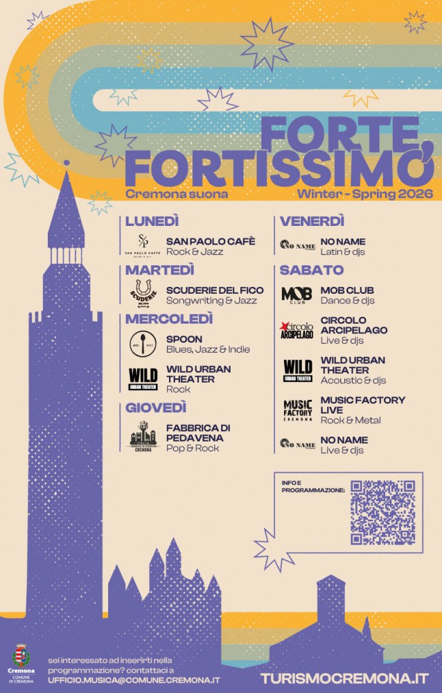 Il Comune di Cremona, grazie al lavoro svolto dall'Ufficio Musica del Settore Cultura e Turismo, presenta Forte, Fortissimo – Winter - Spring 2026, programmazione musicale che accompagna la città nei mesi invernali e primaverili, rafforzando la volontà di una Cremona sempre più come spazio vivo di produzione culturale, incontro e socialità.