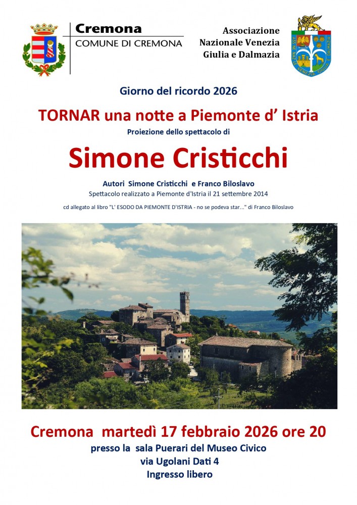 Per la ricorrenza del Giorno del Ricordo tra le iniziative promosse dall'Associazione Nazionale Venezia Giulia e Dalmazia da segnalare martedì 17 febbraio, alle ore 20, nella Sala Puerari di Palazzo Affaitati (via Ugolani Dati, 4), la proiezione del film concerto tenuto da Simone Cristicchi Tornar una notte a Piemonte d'Istria - tratto dal libro L'esodo da Piemonte d'Istria - non se podeva star di Franco Biloslavo registrato a Piemonte d'Istria il 21 settembre 2014 – con introduzione di Tiziano Bellini. L'ingresso è libero.