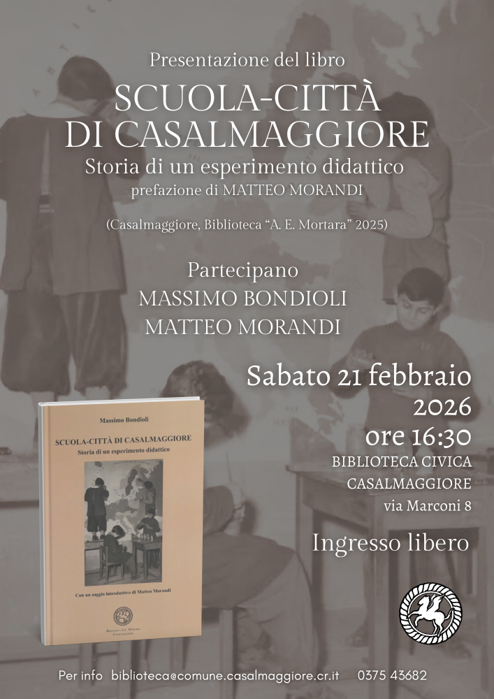La Biblioteca Civica “Anton Enrico Mortara” di Casalmaggiore promuove, sabato 21 febbraio 2026, la presentazione del volume Scuola-Città di Casalmaggiore. Storia di un esperimento didattico, di Massimo Bondioli, con prefazione di Matteo Morandi (Casalmaggiore, Biblioteca Civica “Anton Enrico Mortara”, 2025).