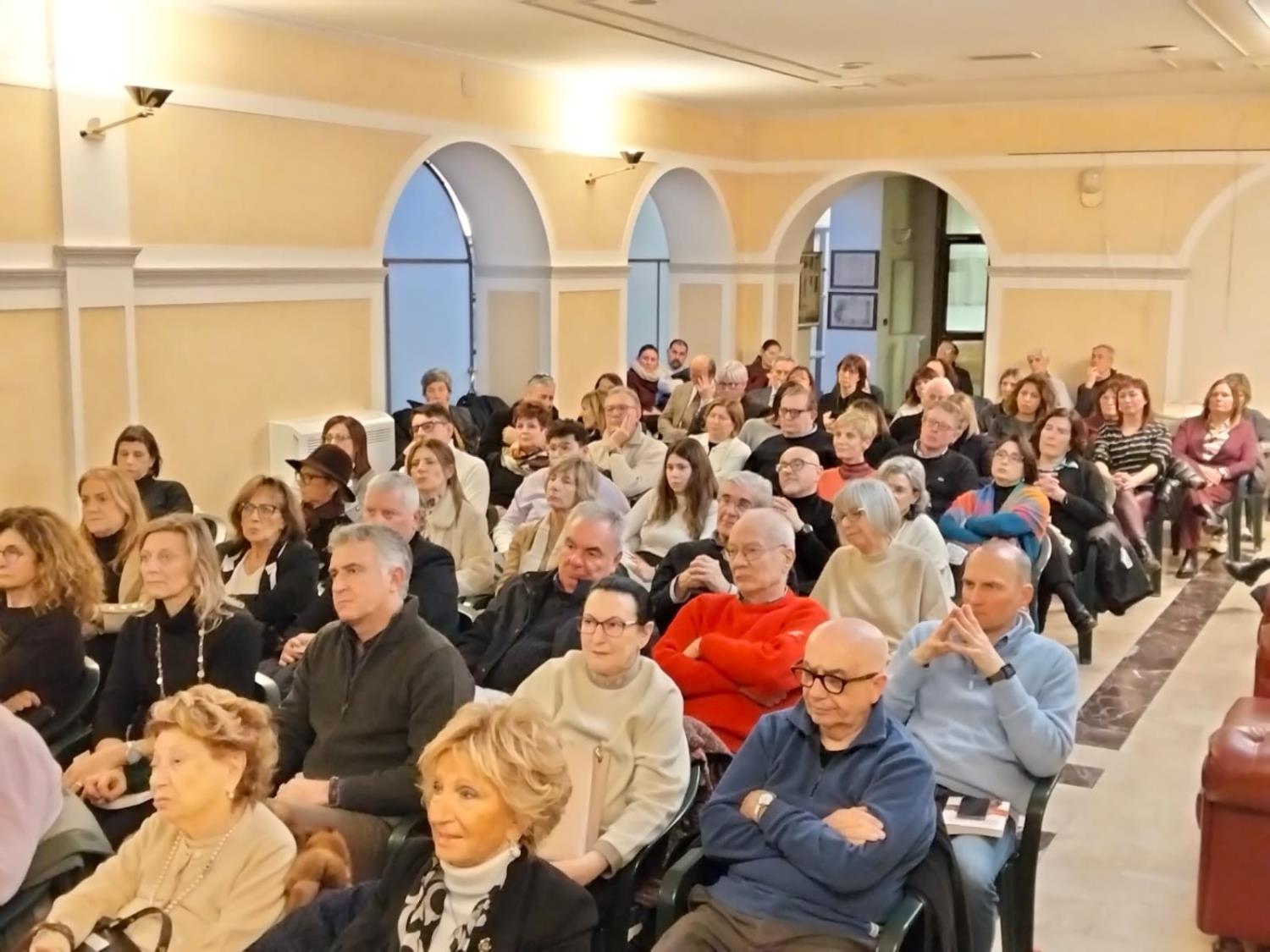 La location, il riempitissimo saloncino conferenze della Società Filodrammatica. l'avvocato Alessandro Zontini, presidente del benemerito sodalizio privato e coordinatore dell'evento, patrocinato del Comune di Cremona.