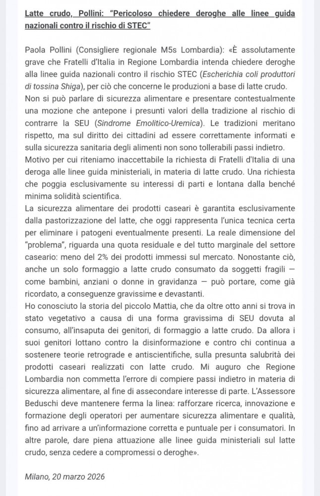 Mozione che (considerata l'omogenea militanza tra interrogante ed interrogato) avrebbe fatto auspicare un esito accogliente. Cosa che non è paradossalmente. La risposta dell'Assessore Lombardo all'Agricoltura, evidentemente più sintonico agli interessi del comparto produttivo, è stato, dal punto di vista del recepimento della raccomandazione in senso prudenziale del consumo dei latticini a latte crudo, una delusione.