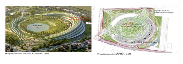 Ed è qui che nasce il problema: il progetto reale è molto diverso dal progetto raccontato nella trasmissione RAI “La pelle del mondo” del 28 marzo scorso del Prof Stefano Mancuso, insigne scienziato e massimo esperto di piante e verde urbano. L'architetto Mario Cucinella durante l'intervista ha illustrato la visione architettonica e ambientale del progetto originale presentato il 30 novembre 2023, parlando di boschi della salute, di giardini pensili sull'estesa sommità dell'anfiteatro del corpo centrale, di un lago centrale di circa 100 m di diametro che mitiga la calura estiva e preserva l'area circostante dalle gelate invernali...